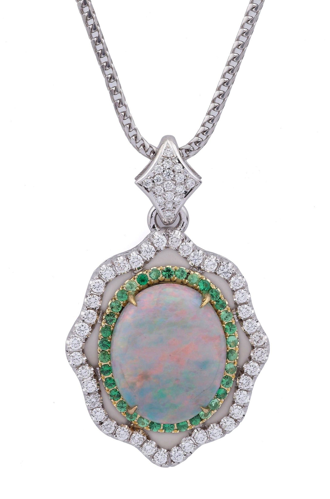 10.50 Grams, 18K White & Yellow Gold Pendant, Center 5.71ct Australian Opal, 34 U Set Tsavorite Totaling 0.49ct, 40 U Set Diamonds & 17 Pave Diamonds Totaling 0.62ct Of F-G Color, VS Clarity.