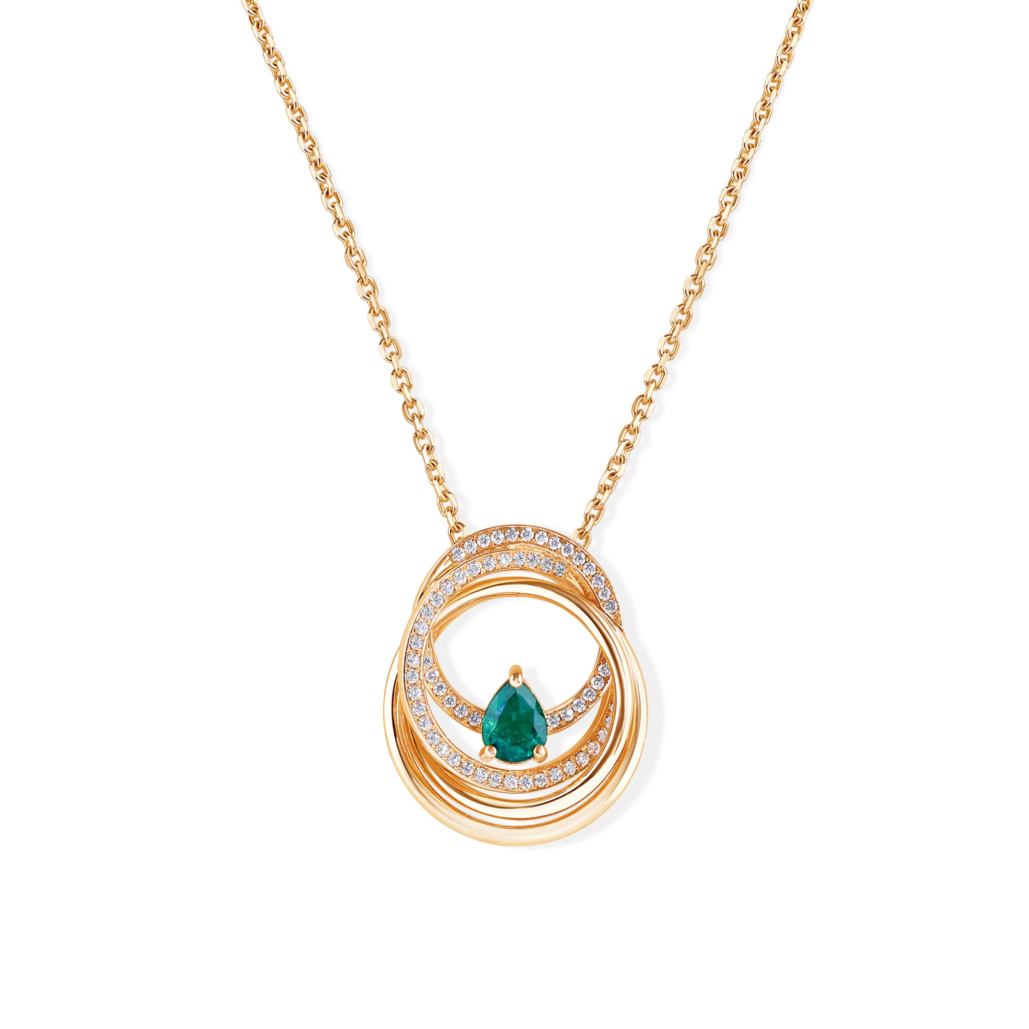 Embrace timeless elegance with this beautiful "Circle of Life" necklace. Crafted in 11.94 Grams 14k gold, the design showcases gracefully intertwined circles, each shimmering with meticulously set 63 pavé diamonds Totaling 0.37ct Of E-F Color, VS1 Clarity. At the heart of this meaningful piece lies a rich, 0.66ct pear-shaped Zambian Emerald, adding a touch of vibrant color and symbolizing renewal and growth