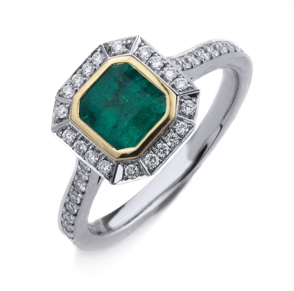 6.90 Grams Custom Designed Platinum &18K Yellow Gold Bezel Ladies Ring. Center 0.97ct Cushion Colombian Emerald & 44Pave Shank Diamonds Totaling 0.30ct Of F Color, VS Clarity.