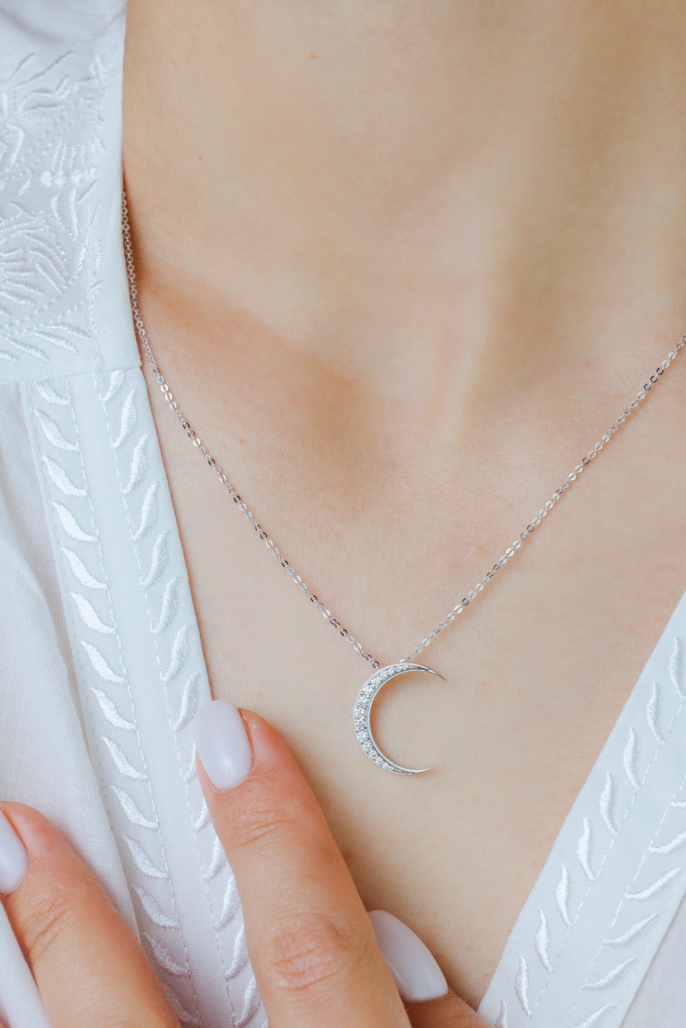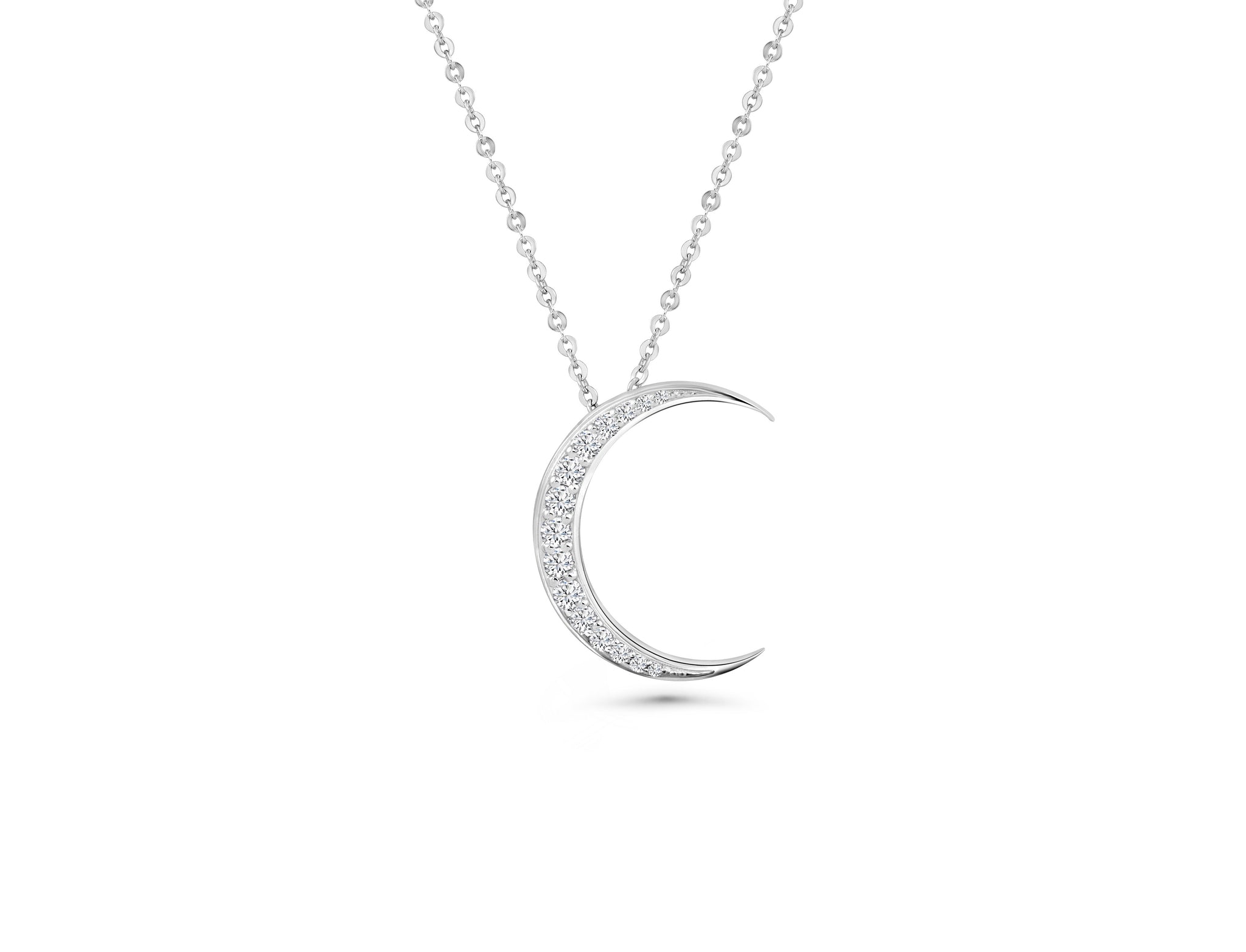 14k White Gold Big Moon Pendant With 15 Round Brilliant Diamonds Totaling 0.20ct Of E-F Color, VS1 Clarity.