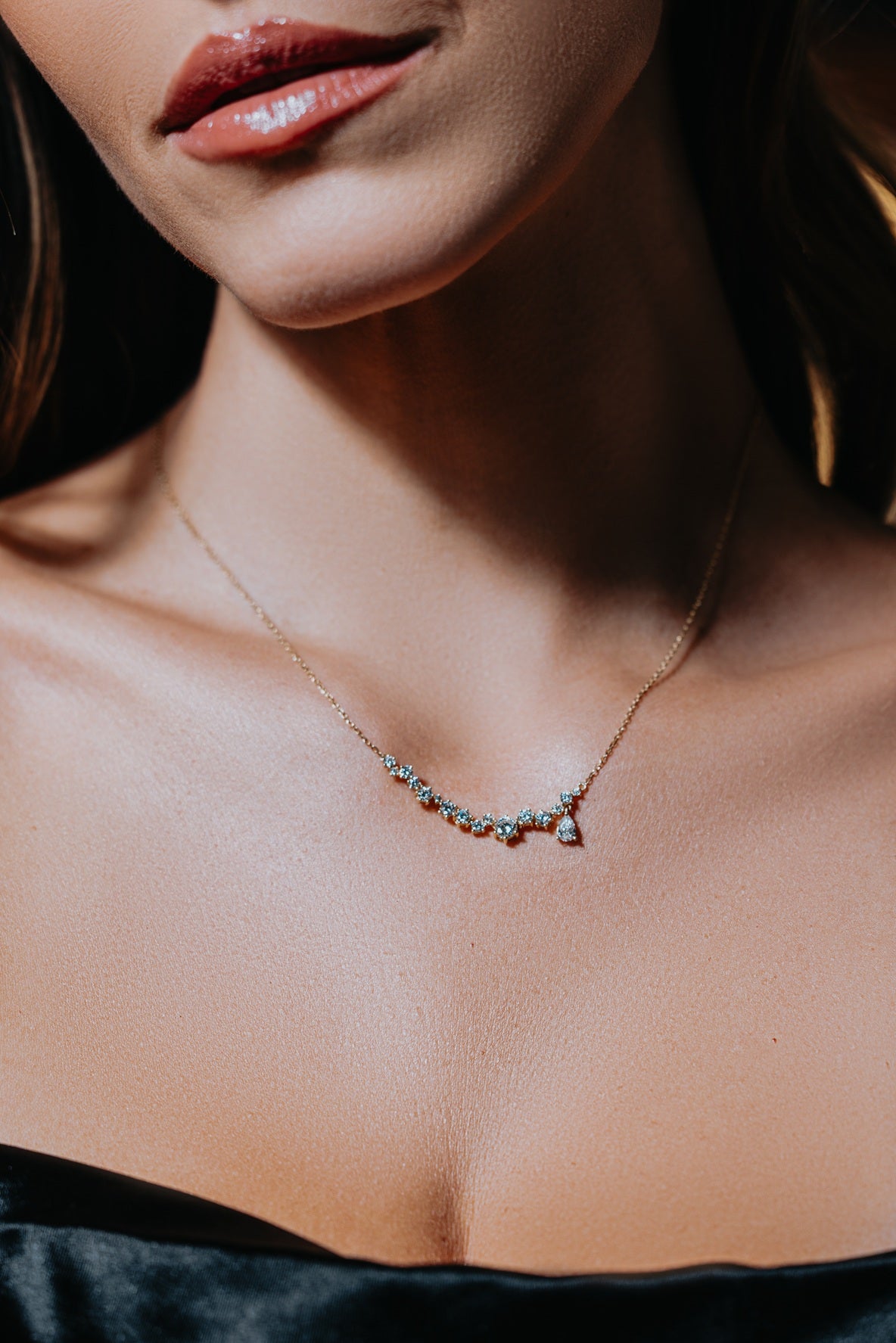 -14k Yellow Gold Custom Designed Ladies Necklace With Sixteen Round Brilliant Diamonds Totaling 1.14ct Of F Color, VS1 & 0.26ct Pear Shape Diamond Of F Color, VS1 Clarity.