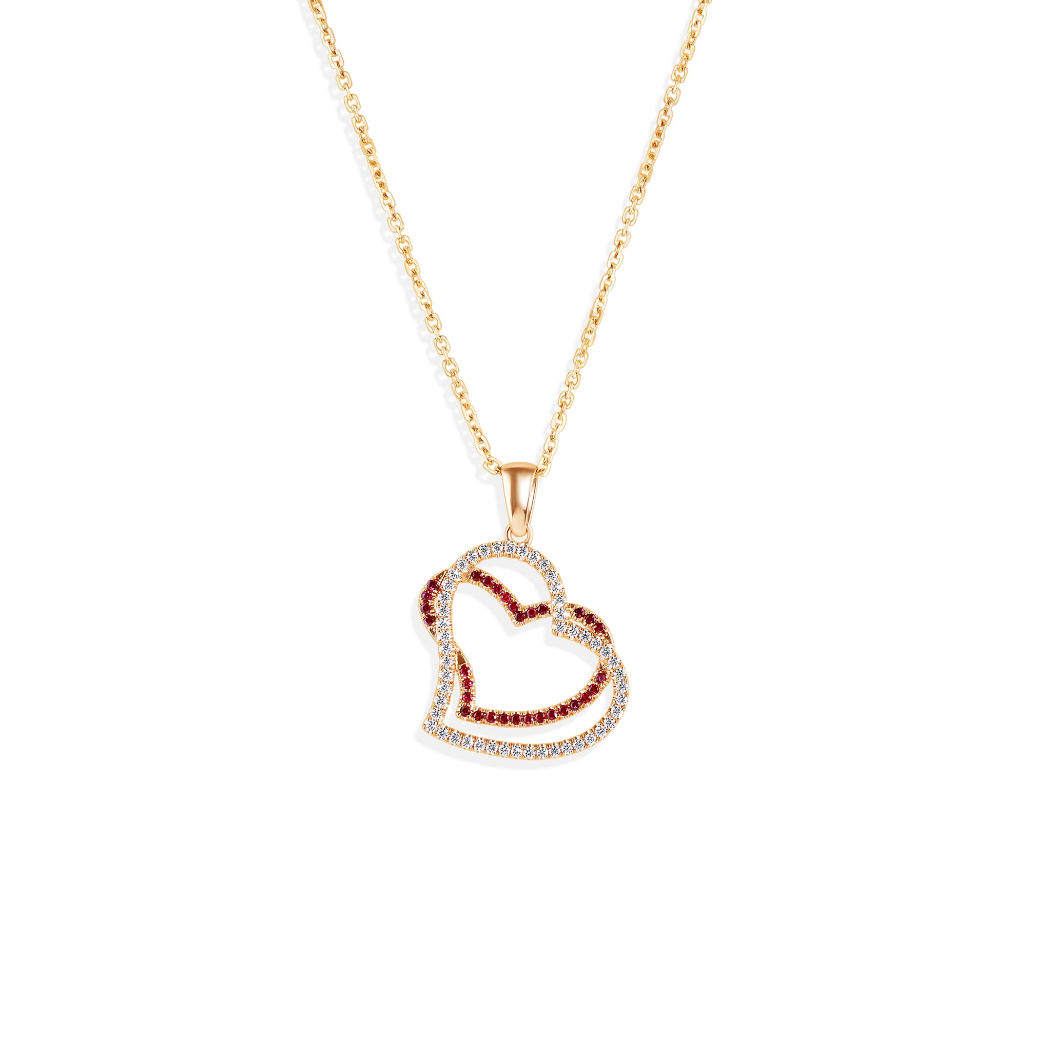 -18k Yellow Gold Double Heart Pendant With 50 Round Brilliant Diamonds Totaling 0.25ct Of E-F Color, VS1 Clarity & 31 Diamond Cut Rubies With 18 Inches, 2.21-2.23 Grams, 14k Yellow Gold Diamond Cut Rolo, 1.2mm Thick