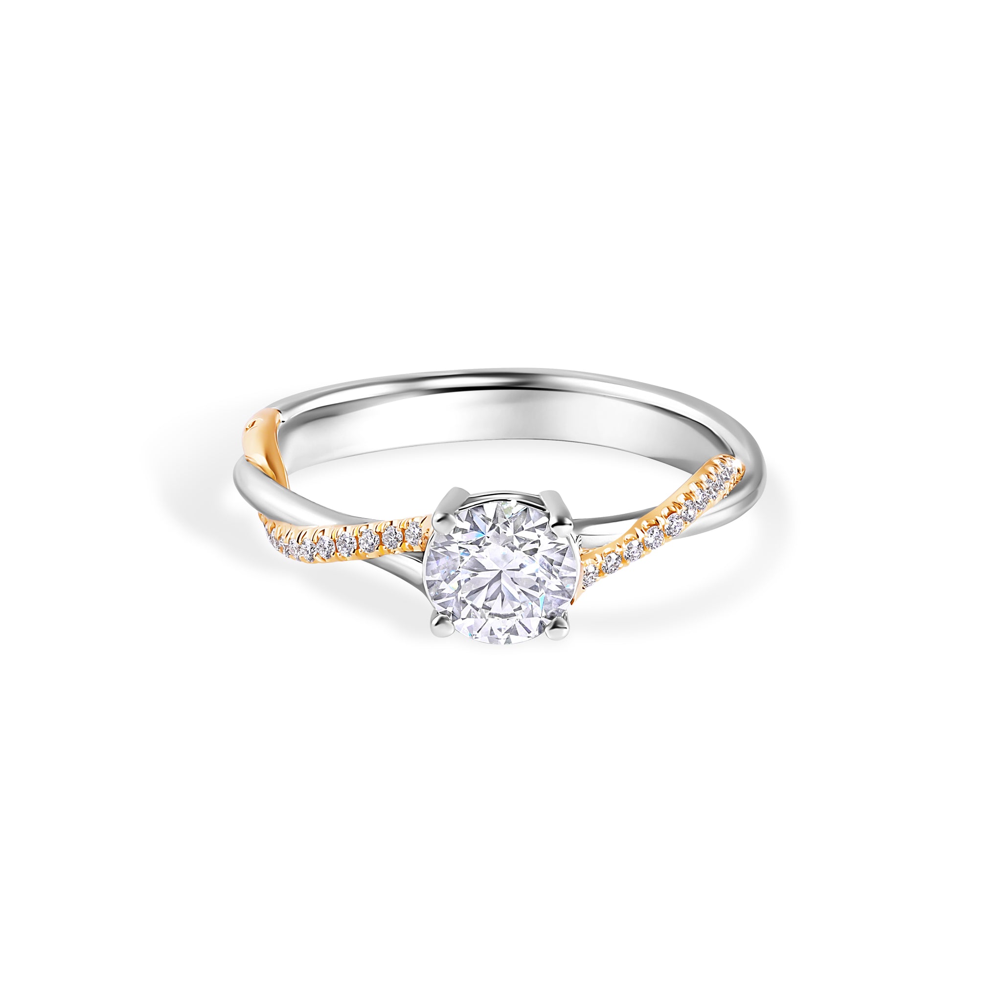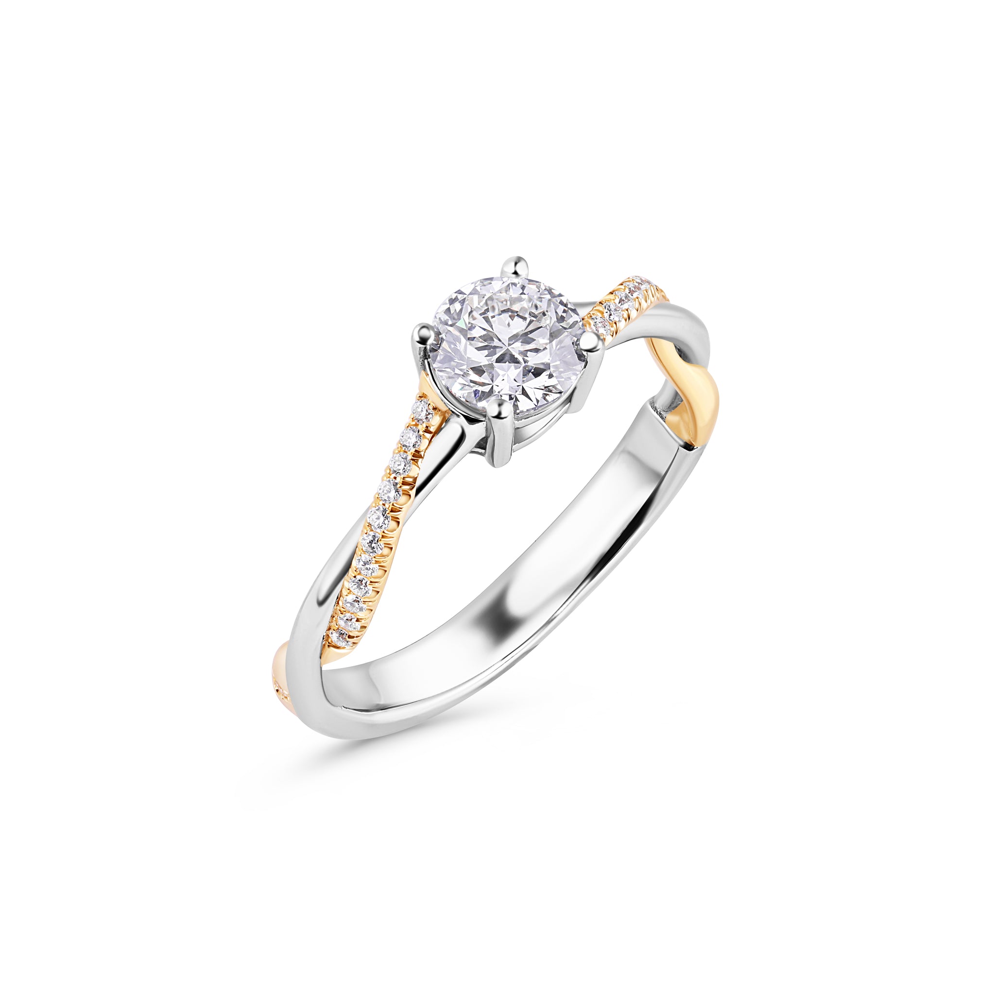 14k Yellow Gold Custom Designed Ladies Tight Twist Engagement Ring With 0.72ct Round Brilliant Center Of F Color, I2 Clarity & 24 Shank Diamonds Totaling 0.10ct Of E-F Color, VS1 Clarity