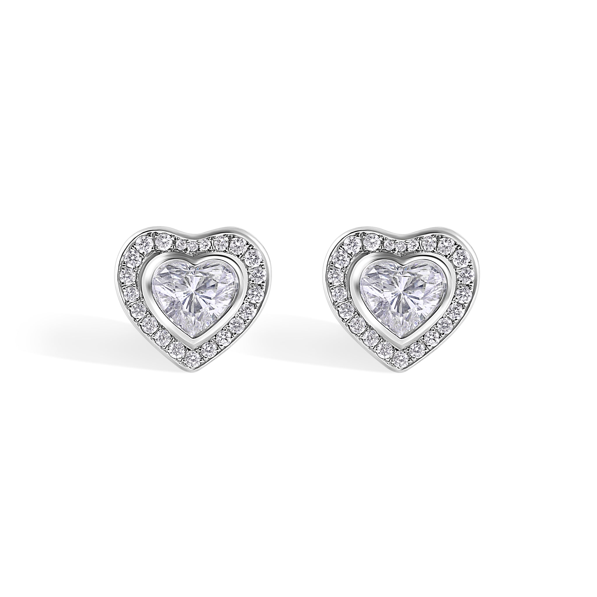 Earrings- 18k White Gold Custom Designed Ladies Studs With Two Heart Brilliant Diamonds Totaling 0.98ct Of D-F Color, SI1 Clarity & 44 Pave Round Brilliant Diamonds Totaling 0.21ct Of F Color, VS1 Clarity.
