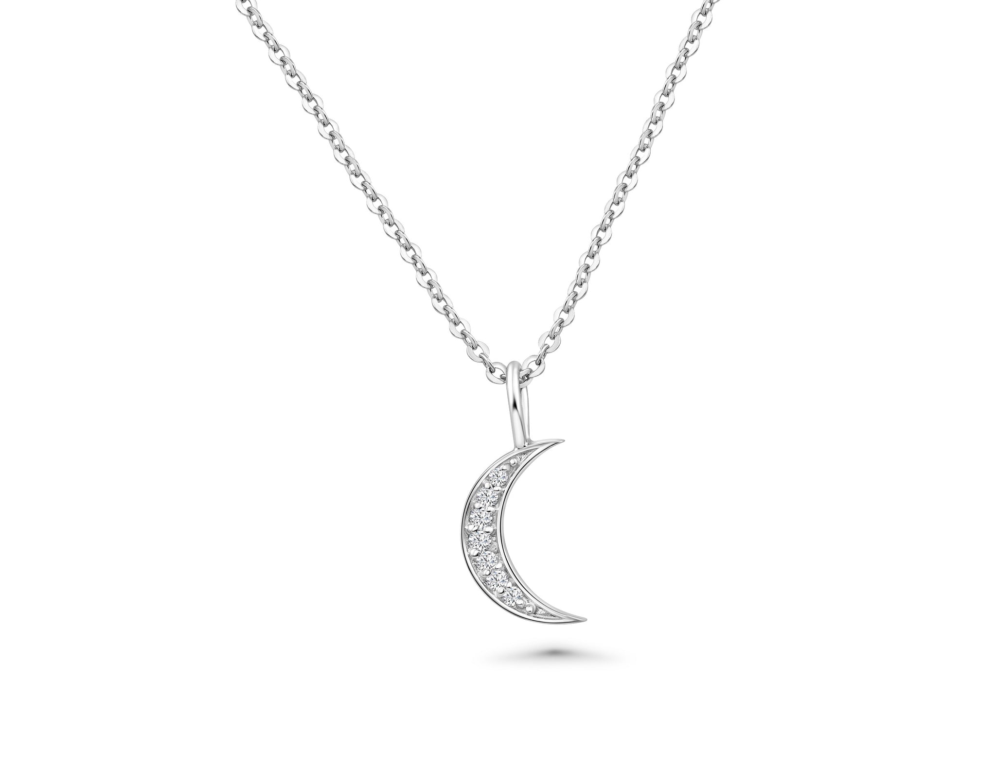 14K White Gold Moon Necklace Containing 7 Round Brilliant Diamonds Totaling 0.06ct Of F Color, VS Clarity.